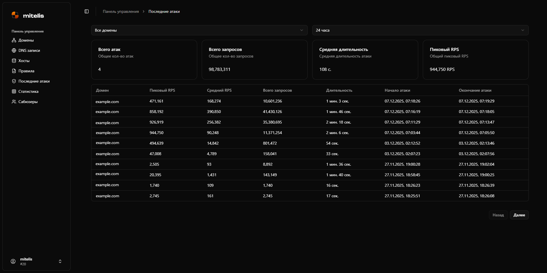 - Детализация по доменам - пиковый и средний RPS, всего запросов, длительность, время начала и окончания