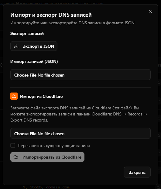 - Импорт из Cloudflare - быстрая миграция DNS записей из Cloudflare