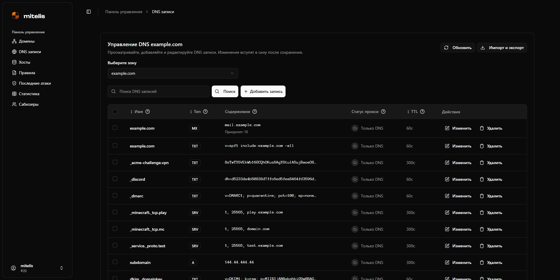 - Все типы записей - A, AAAA, CNAME, MX, TXT, SRV и другие