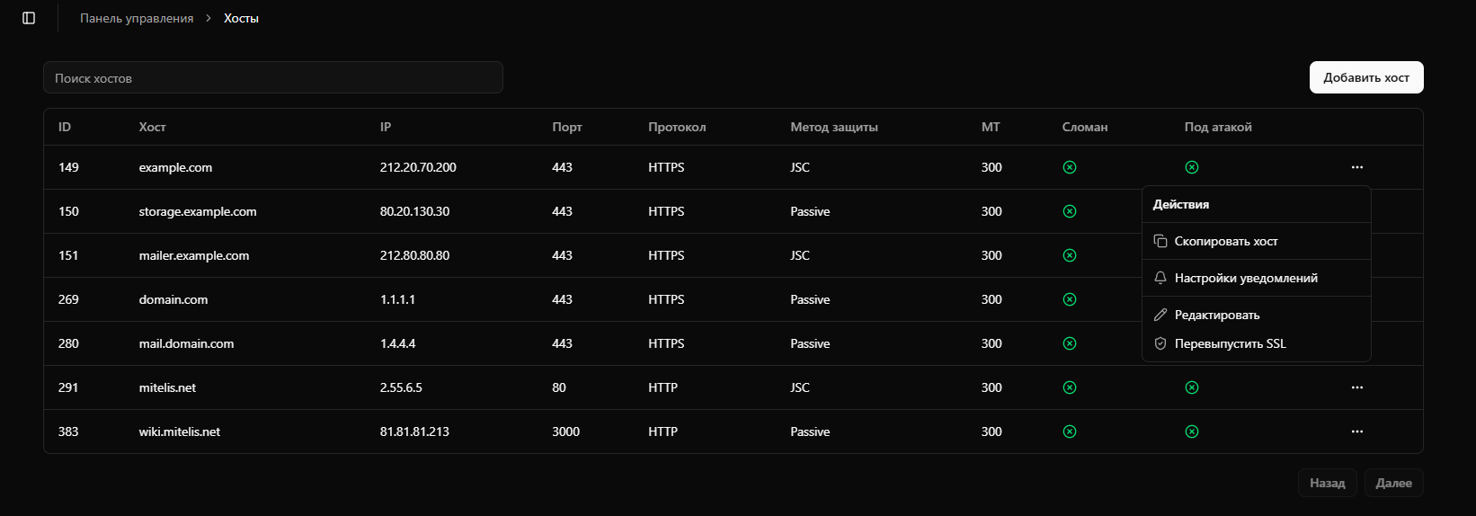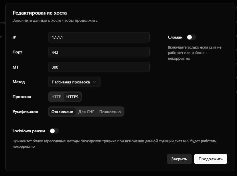 - Добавление хоста - настройка IP адреса, порта, протокола (HTTP/HTTPS)