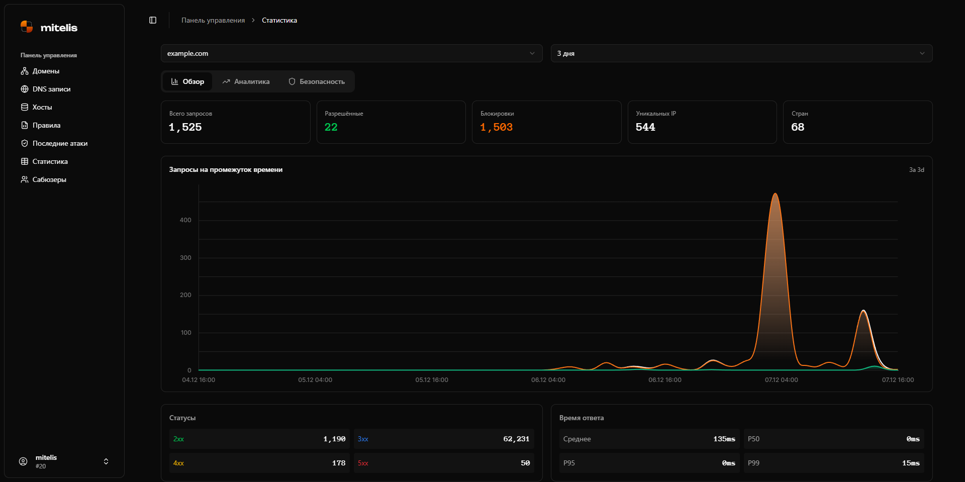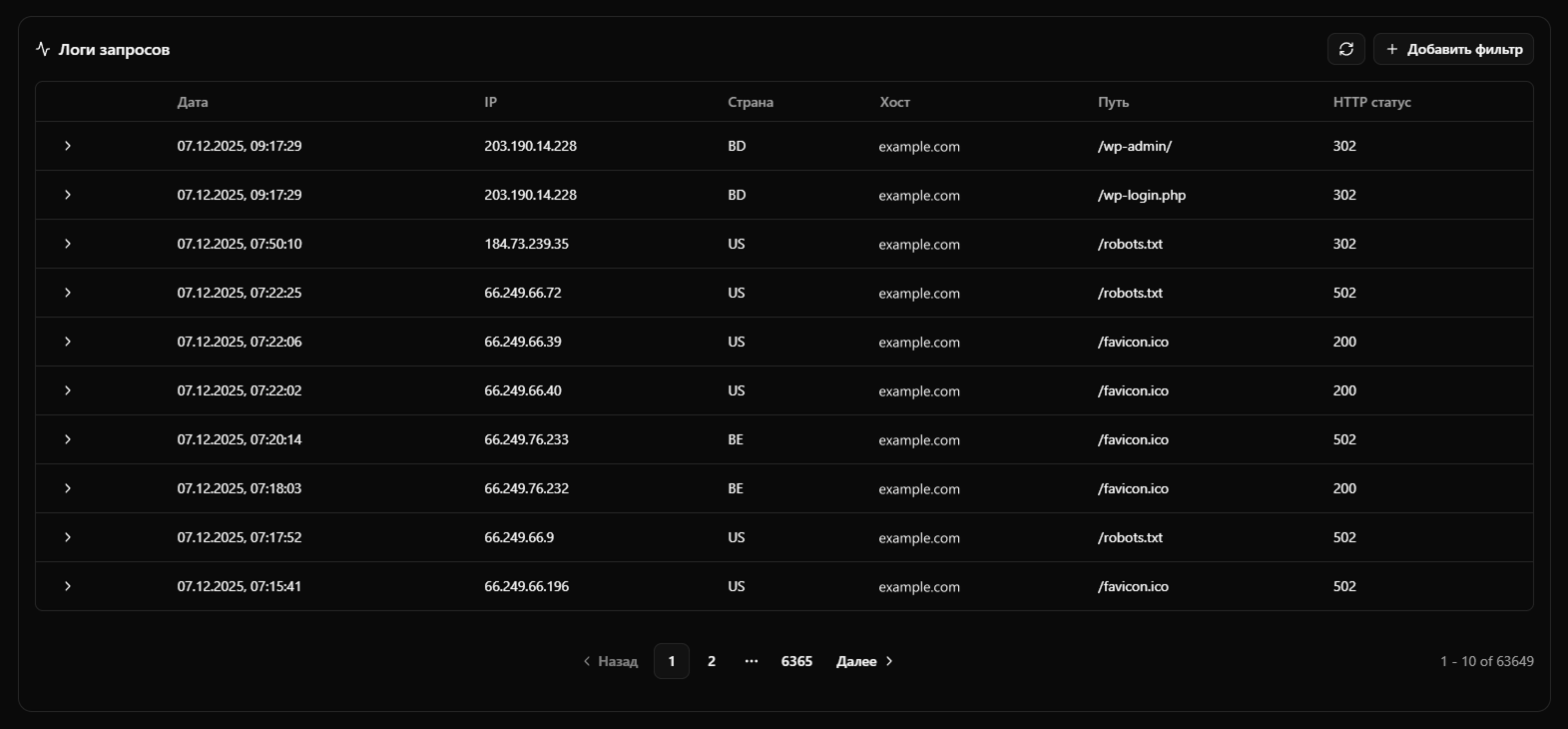- Логи запросов - полный журнал всех запросов с фильтрацией по дате, IP, стране, хосту, пути, HTTP статусу