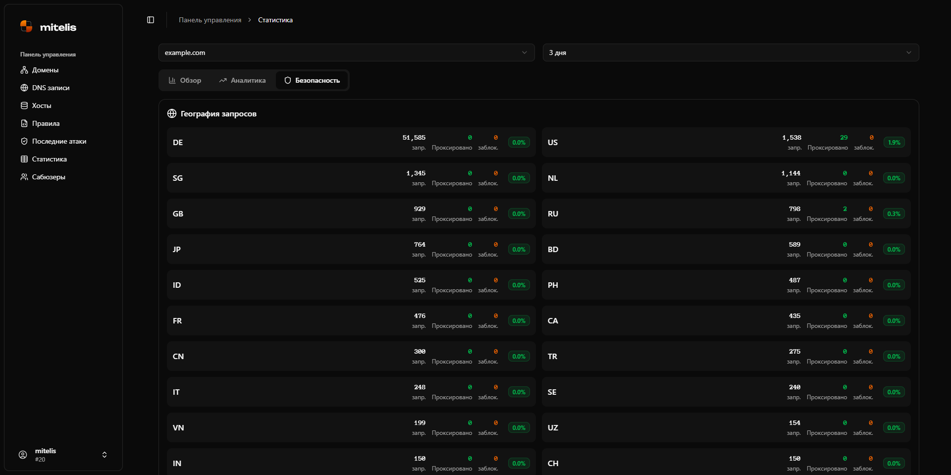 - Общая статистика - всего запросов, разрешённых, блокировок, уникальных IP, стран
